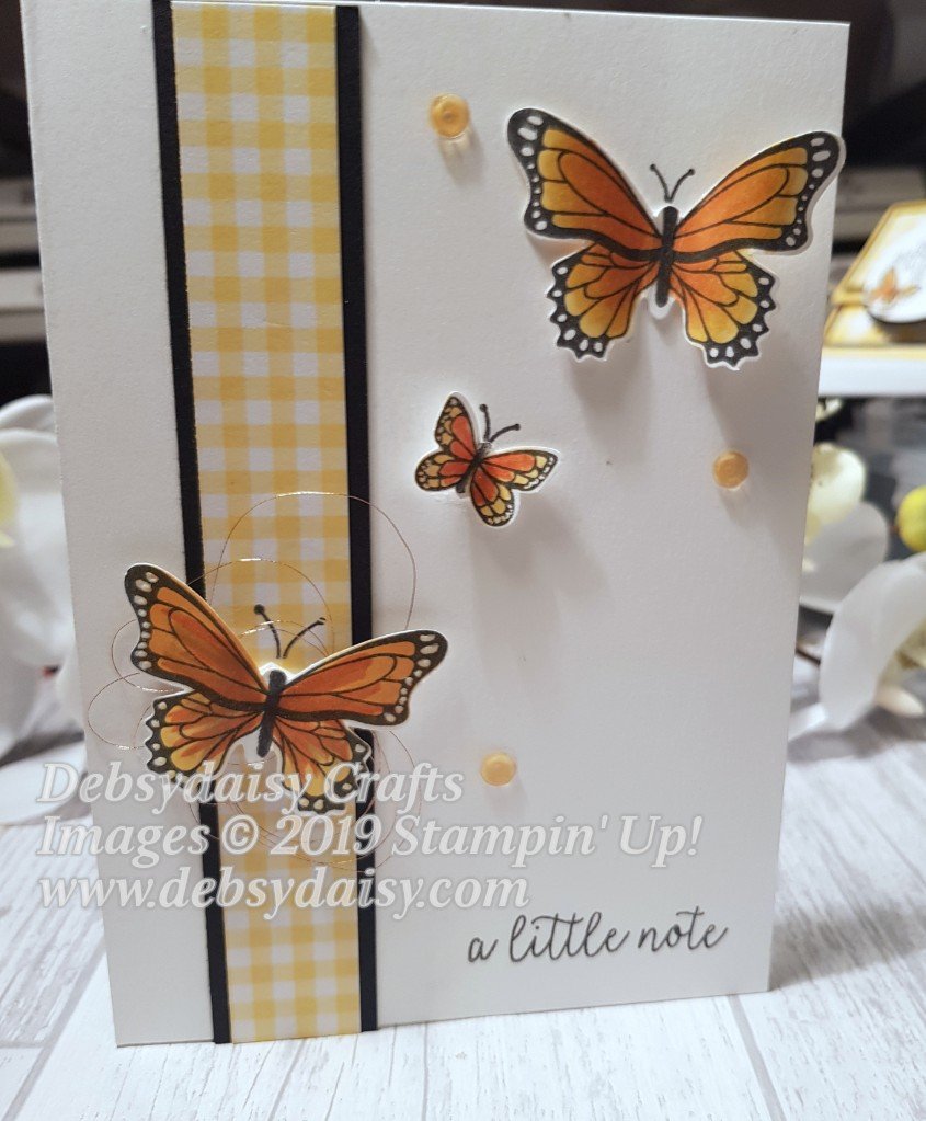 This is a simple 4 x 6″ card using just a 1 inch strip of the Gingham Gala Paper layered onto another strip of Basic Black Card. This paper comes in a 6×6 pack and a little goes a long way so you could make 6 cards like this using one sheet of paper. The butterflies have been stamped in memento ink and coloured using Stampin Blends. The coordinating adhesive backed sequins are just gorgeous, they have an iridescent sheen which just give your card an extra little something.