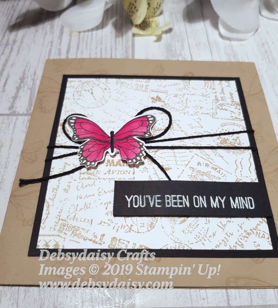 My final card is a slightly more grungy style. I have stamped the butterflies on the cardbase using the tone on tone technique. The centre panel of this card was stamped using the Post Script Background Stamp. The sentiment was stamped and heat embossed and then the card was finished using some black twine and adding a stamped and punched butterfly.