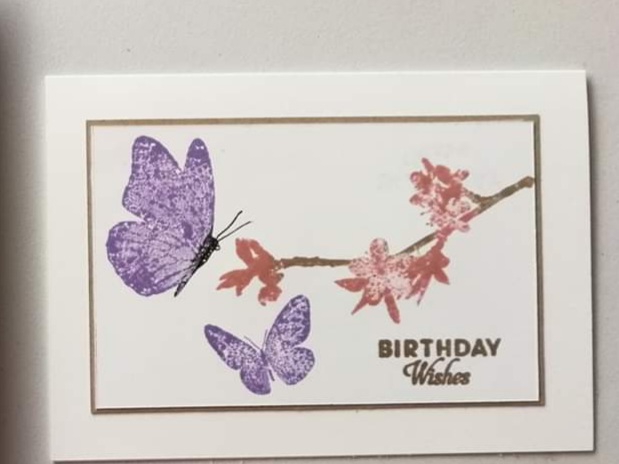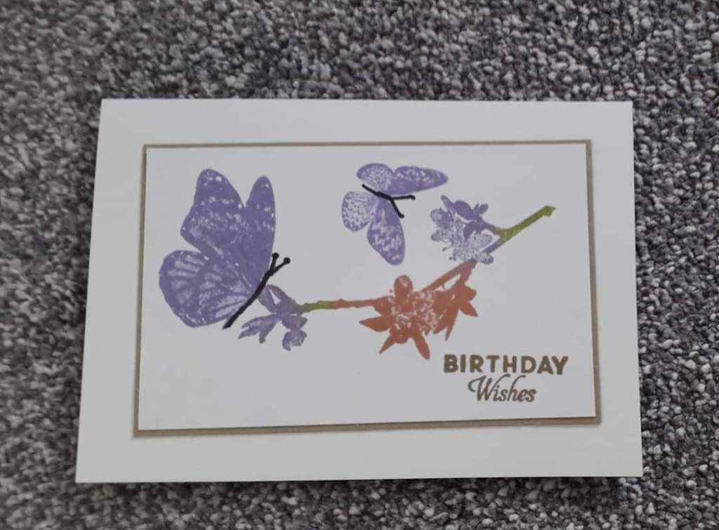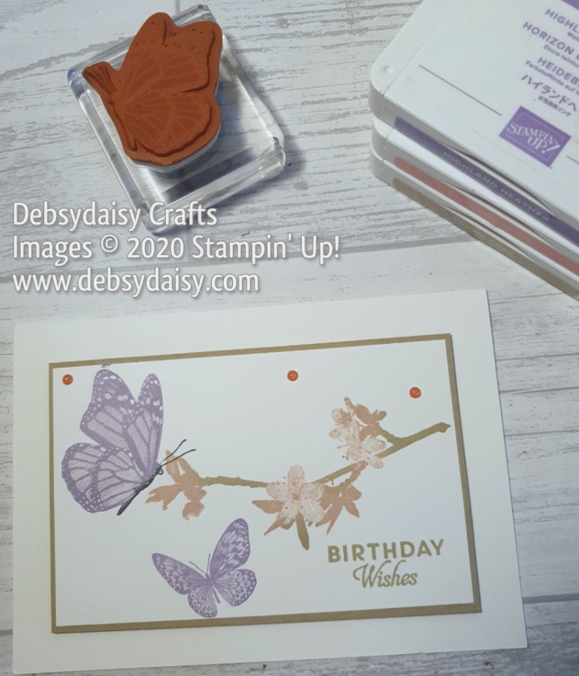 - Ink up the larger butterfly again using the Highland Heather ink but using the edge of a Memento Black Inkpad, carefully ink the body of the butterfly. Stamp just above the branch.