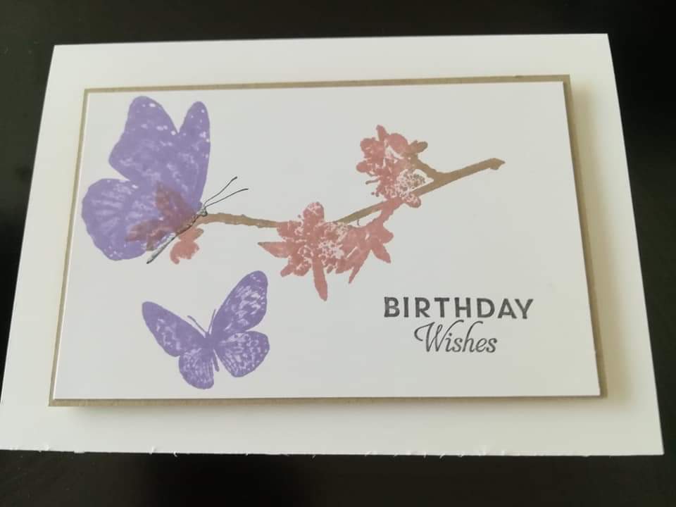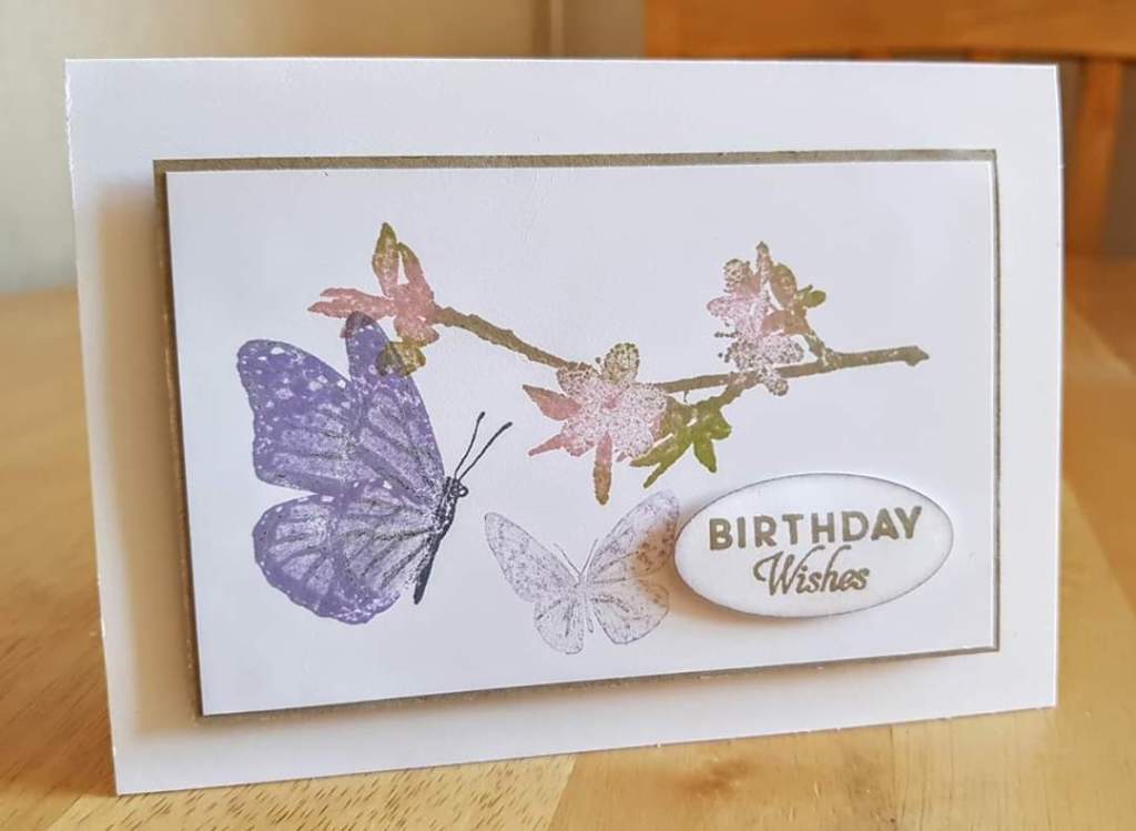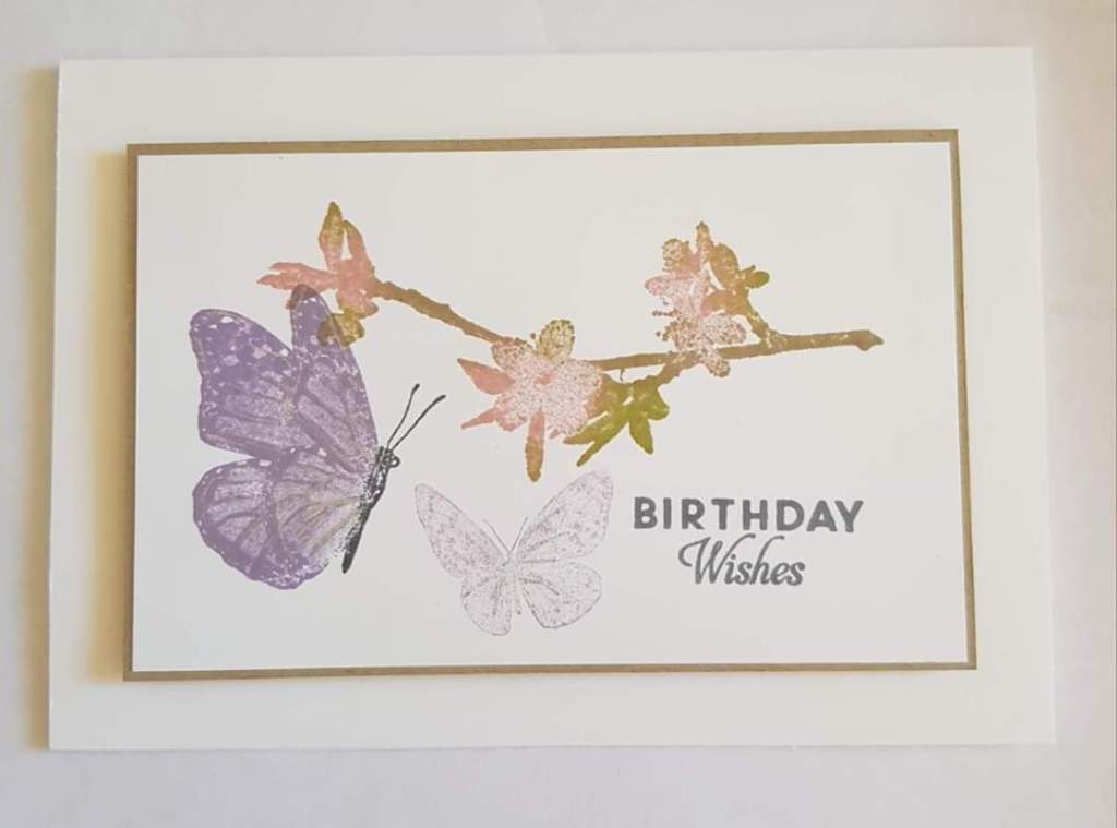 - Ink up the branch in blushing bride ink and then using a dauber, ink the branch with crumb cake between the blossoms. Then stamp above the sentiment.
