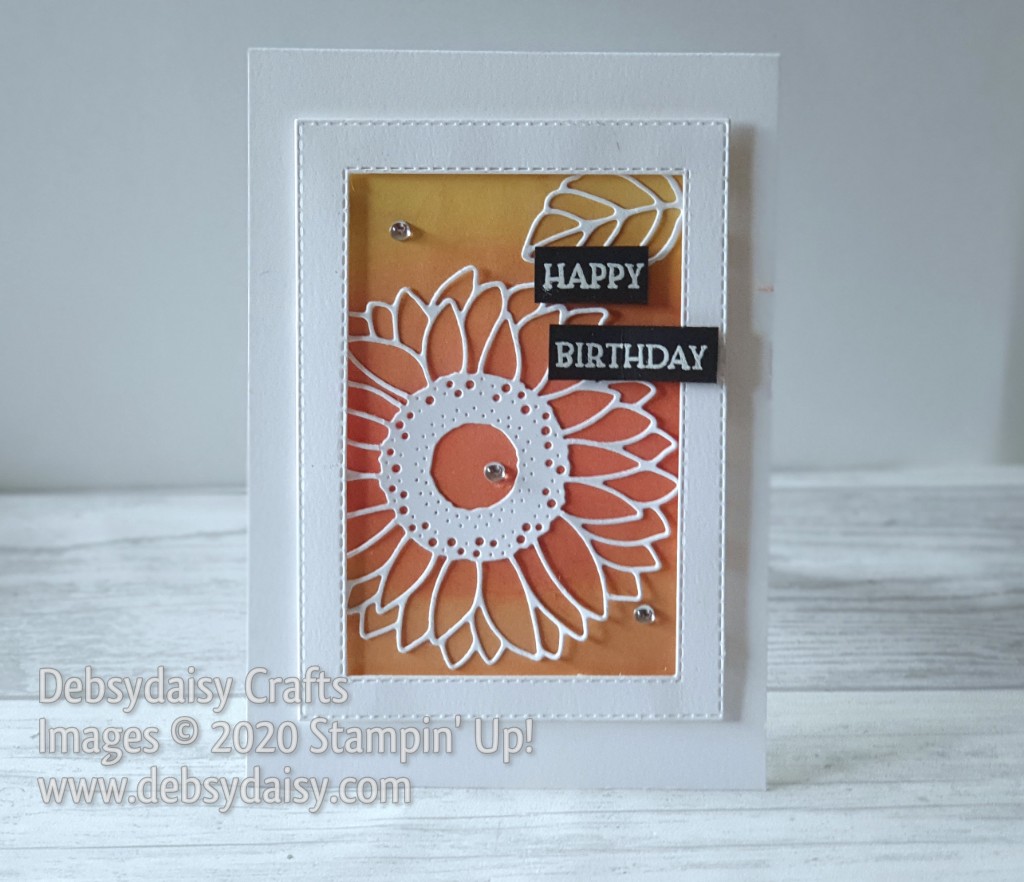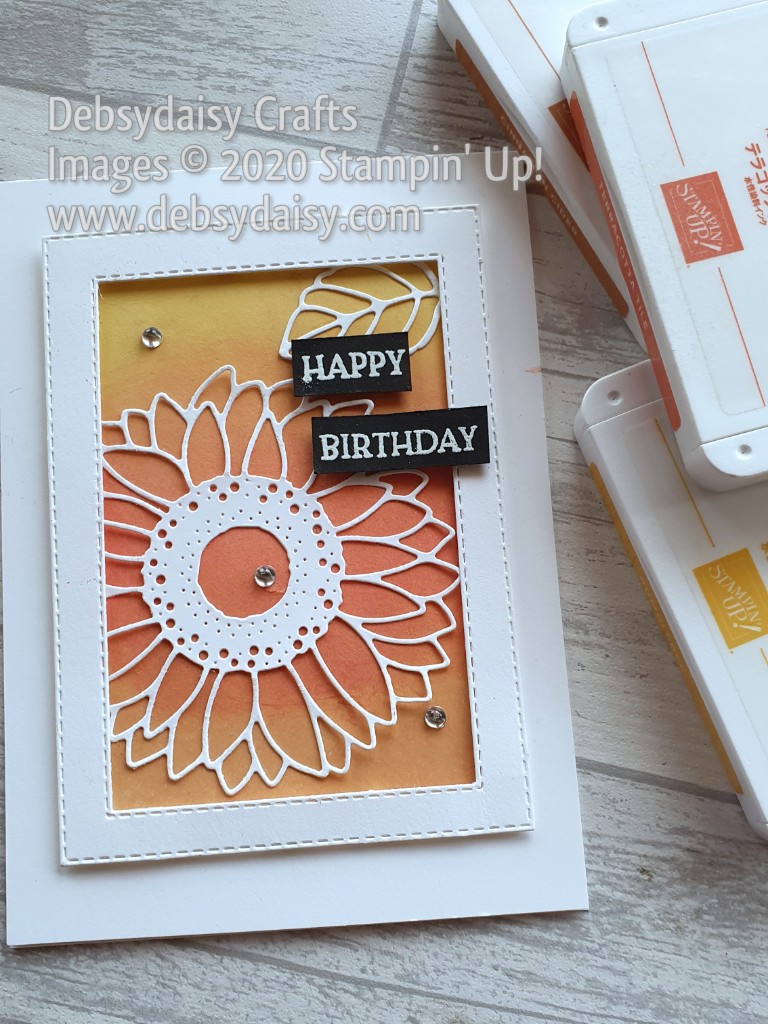Todays card is a very simple but effective card just using white Cardstock and 3 colours of Inkpad. I used a sponge brayer to roller the inks from light to dark on a small panel of White Card and adhered the die cut sunflower and leaf directly to it. I then die cut a frame using the stitched layered rectangles and stuck that to the inked panel using dimensionals. This was then all adhered to a standard tent fold card base.